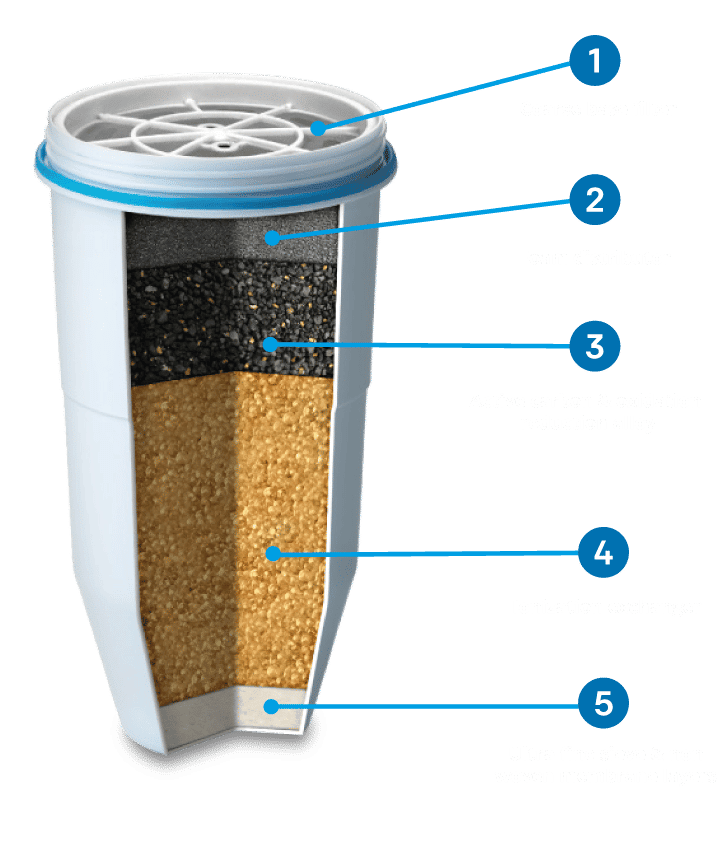 ZeroWater’s 5-stage filtration uses a unique combination of mechanical filtration, activated carbon, and ion exchange technology. It removes: